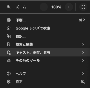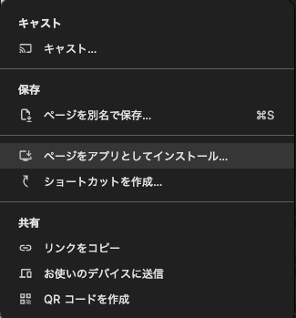 2. Chromeの右上メニューから「キャスト、保存、共有」→「ページをアプリとしてインストール」